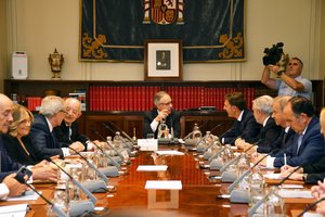 El alcalde de Toledo, Carlos Velázquez, ha presidido una reunión en el Ayuntamiento de Toledo junto a los portavoces de los grupos municipales, la empresa adjudicataria de los trabajos de asistencia técnica para la elaboración del proyecto del Plan de Ordenación Municipal (POM), Ezquiaga Arquitectura, Sociedad y Territorio S.L., además de técnicos municipales, y los concejales de Planeamiento Urbanístico, Florentino Delgado; el de Medioambiente, Río Tajo y Deportes, Rubén Lozano y el de Hacienda, Fondos Europeos y Participación Ciudadana, Juan José Alcalde.